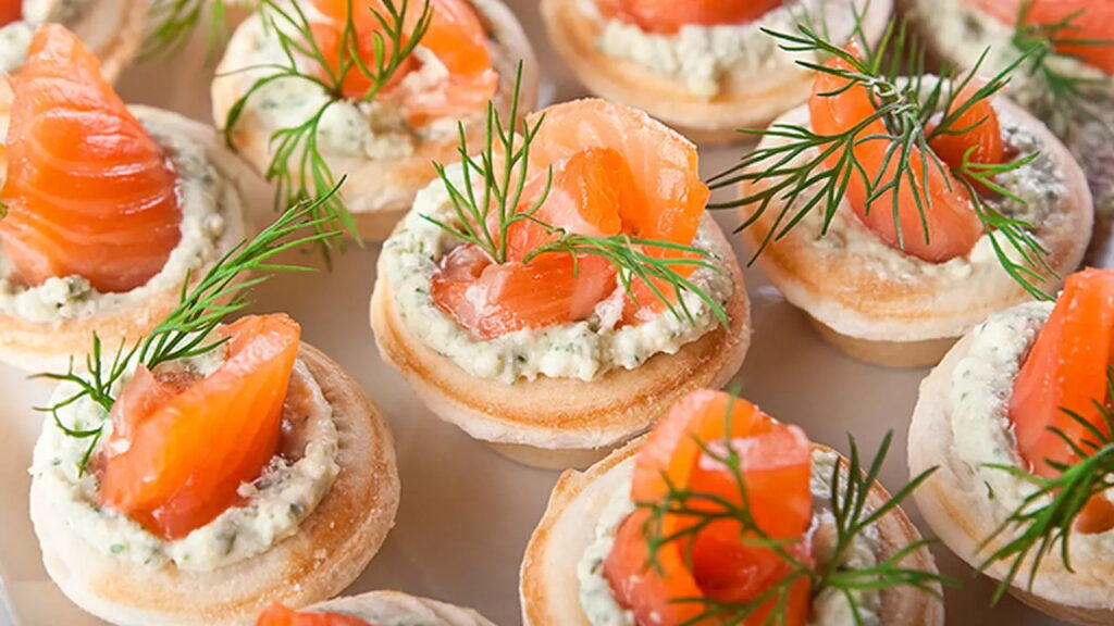 Bruschtele cu somon și crema de brânză se servesc reci.