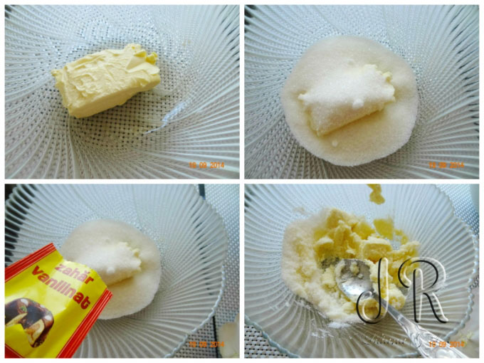 Untul (la temperatura camerei) se amestecă cu zaharul și zaharul vanilat, se adaugă pe rând ouăle, se amestecă până se obține o masă omogenă, apoi se presară praful de copt și făina.
