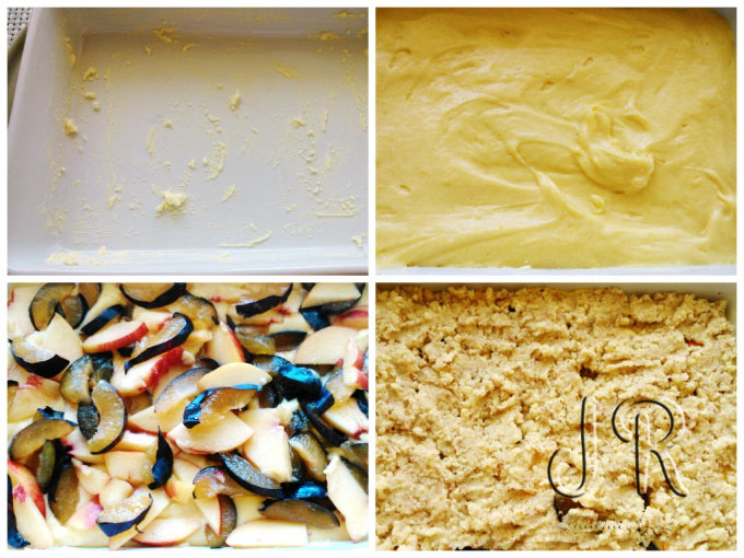 Un vas termorezistent se unge cu unt, se întinde stratul de aluat, peste el se aranjează fructele, apoi amestecul de migdale.
