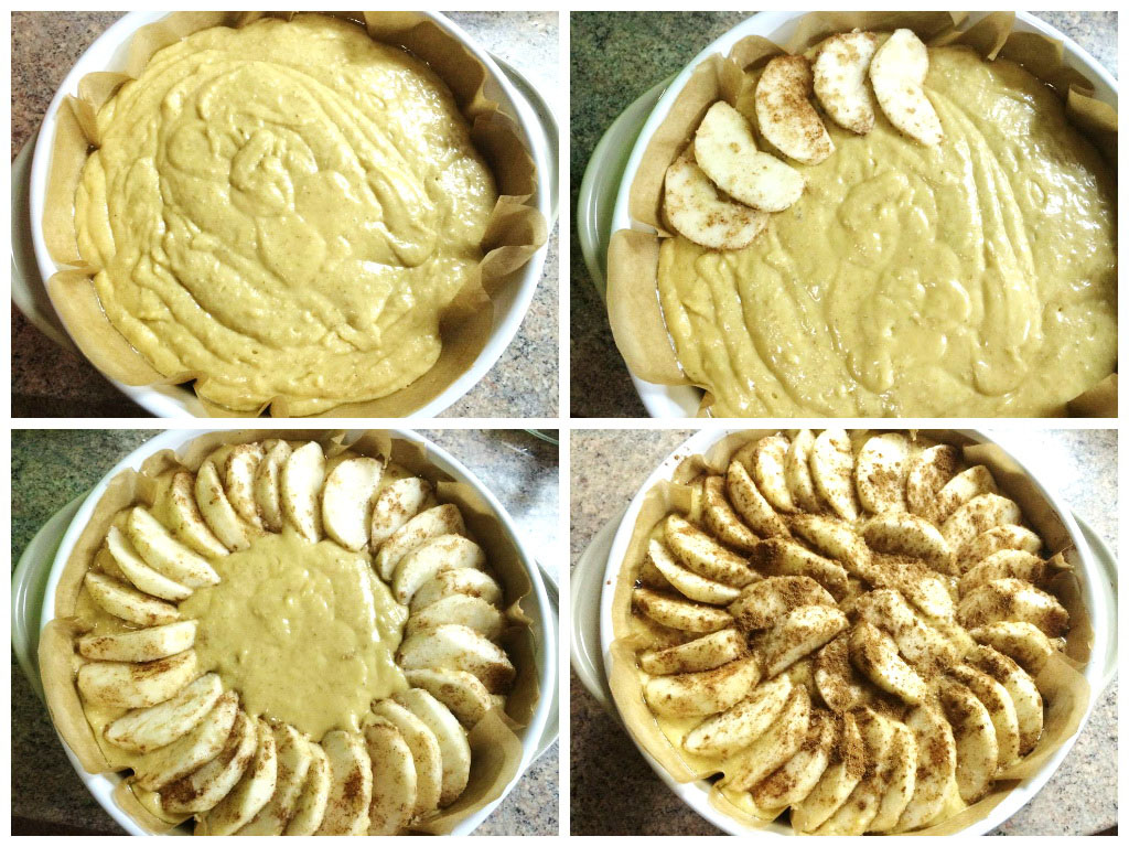 Turnăm aluatul, așezăm frumos deasupra feliile de mere și pudrăm generos checul cu scorțișoara măcinată.