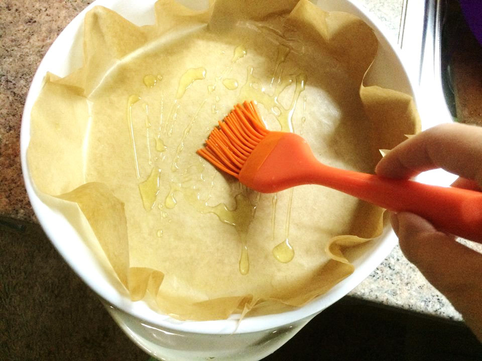 O formă rotundă pentru chec o tapetăm cu hârtie de copt și o ungem cu ulei.