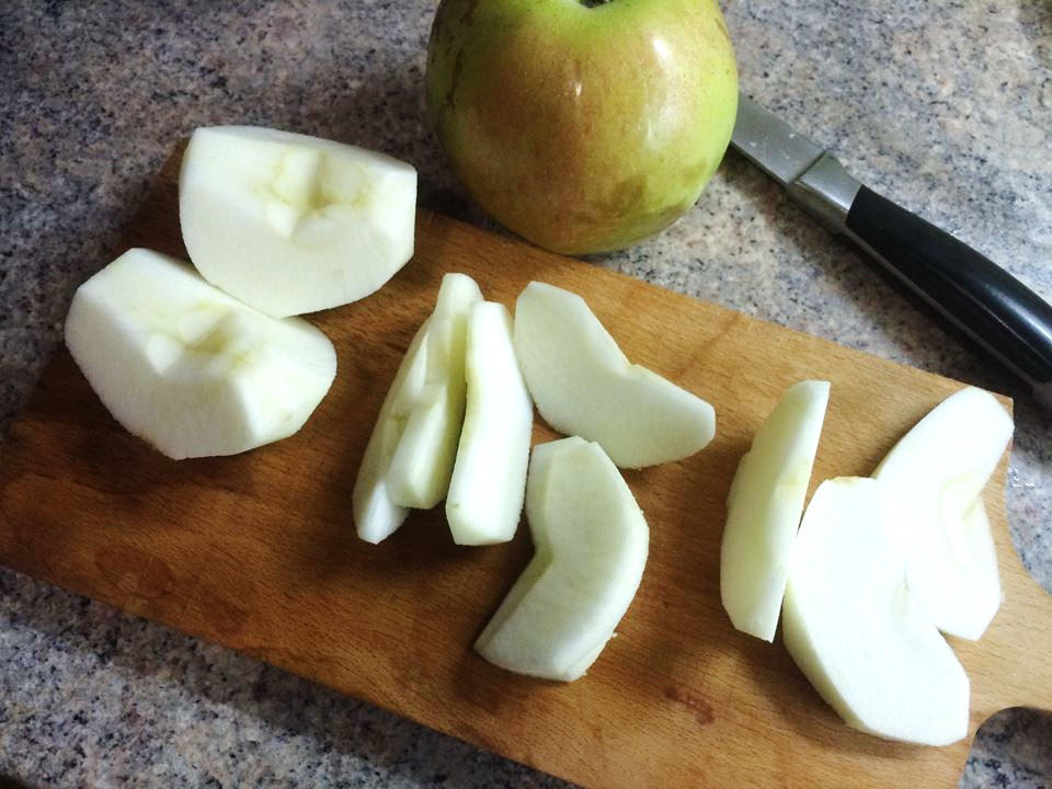 Curățăm merele de coajă, cotoare și le tăiem felii subțiri de 0,5cm. Le pudrăm cu o lingură de făină, una de zahăr și o linguriță de scorțișoară măcinată.