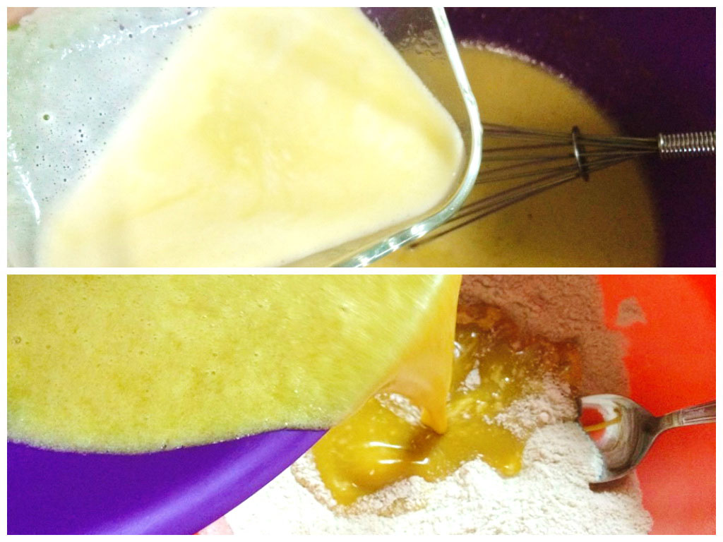 Apoi, incorporăm untul și turnăm masa lichidă peste făină. Uniformizăm bine cu o lingură, trebuie să obțineți un aluat de consistența unei smântâni groase.